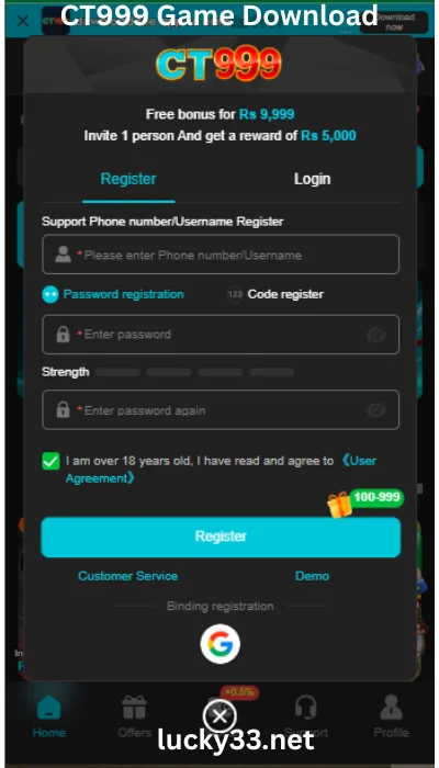 Get the official app of CT 999 and click the register option. Enter your phone number and make a strong password. An OTP message arrives on your mobile. Type that code in. The account gets ready instantly, and the bonus drops in your wallet.